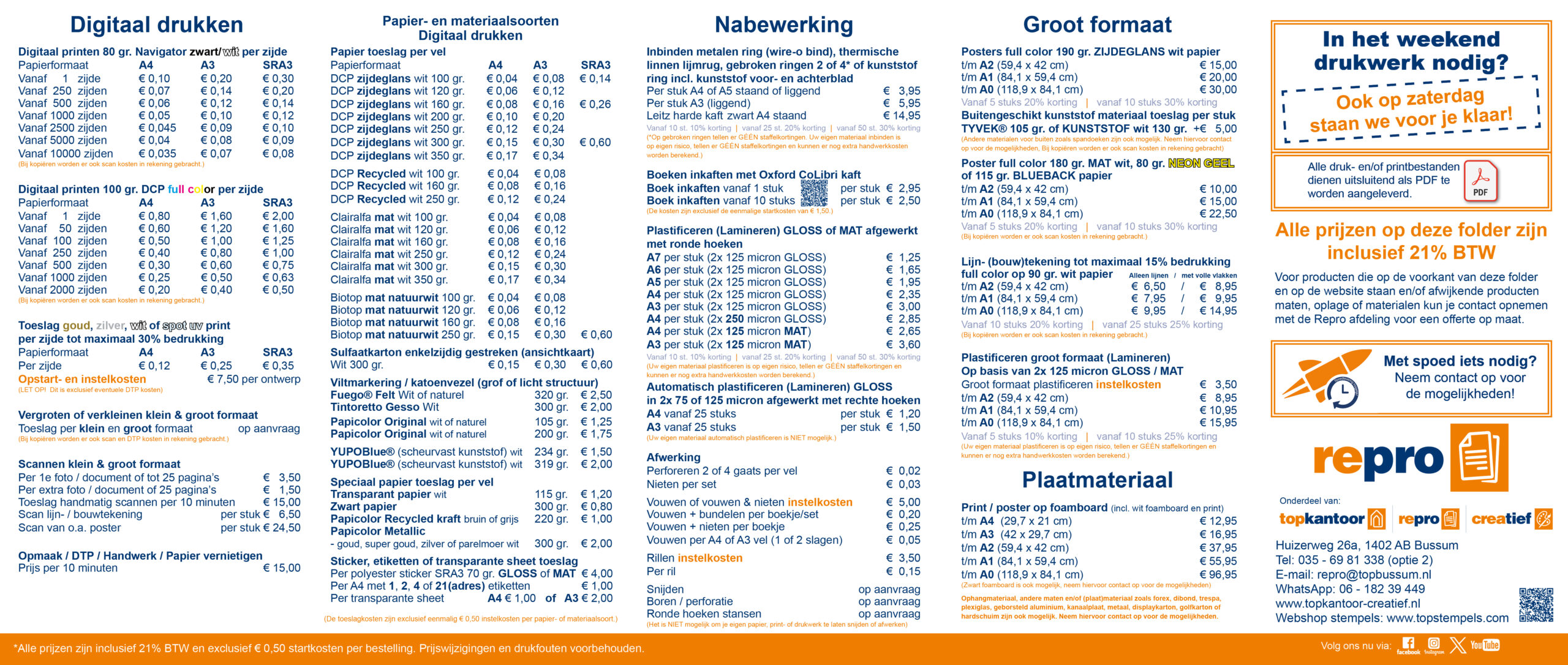 Zit uw wens er niet bij, heeft u vragen of wilt u een offerte op maat? Bel dan naar Michael (maandag t/m vrijdag) of Jeroen (zaterdag) op 035-69 81 338 (optie 2), Whatsapp naar 06-182 39 449 of e-mail naar repro@topbussum.nl. Dit is tevens het adres waarnaar u uw PDF bestanden kunt mailen. Grote PDF bestanden kunt u e-mailen via WeTransfer. Geef daarbij a.u.b. een duidelijke omschrijving van uw wensen, plus uw telefoonnummer en u krijgt zo snel mogelijk antwoord. Voorkom wachten, bestel vooraf!